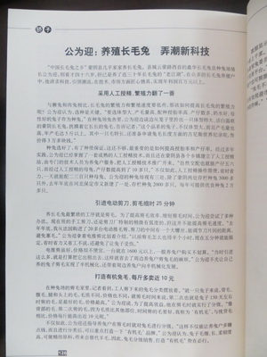 不僅如此,公為迎還指導養兔戶在剪毛時就對兔毛進行分級。“這樣不僅能讓養兔戶多賺點錢,而且進行分類后,可以打造一下‘有機毛’。”公為迎認為,兔子毛細、長、柔韌度高,可做精紡原料,將來會替代羊毛,因此,兔毛分級銷售、打造“有機毛”勢在必行。